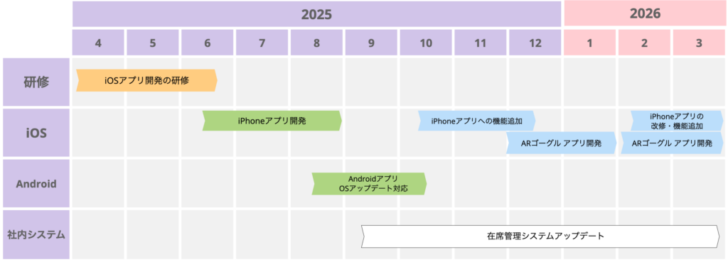 図の「iPhoneアプリの開発」「Androidアプリ OSアップデート対応」にあたる期間では、